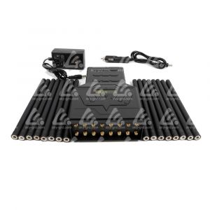Аппарат выполнен в компактном корпусе (без антенн 200 × 133 × 66 мм) и поставляется с комплектом из 27 всенаправленных антенн. Типовая конфигурация обеспечивает суммарную выходную мощность ≈28 W(приблизительно 1 W на полосу) с использованием антенн 2 dBi, что в типичных условиях обеспечивает рабочую зону подавления от 2 до 25 метров (реальная дальность зависит от мощности, рельефа и помеховой обстановки). Для мобильной эксплуатации предусмотрено питание через AC110–240 V с преобразованием на DC12 V и встроенный аккумулятор, дающий около 80 минут автономной работы при типовой нагрузке.